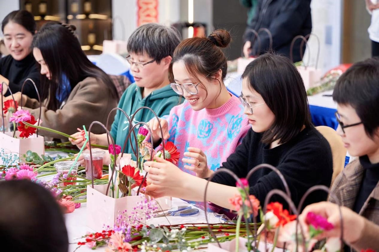 此次活動結合盛和公司房地產行業特點,將活動與樓盤推廣相結合。地點設在盛和公司與融創公司合作的平潮“潮啟未來”項目。活動邀請了花藝老師,給大家講授選花、裁剪、顏色搭配、造型等方面的插花技巧。一枝枝鮮花鋪在桌面上,大家在花藝師的指導下,進行嘗試和實踐。在一修一剪之間,桌上一盆盆細致精美、別出心裁的插花作品逐漸誕生。插花結束后,又舉辦了分享樓盤推廣點贊活動,將樓盤推廣信息在朋友圈內進行展示,在15分鐘內點贊最高6名女職工還可以得到特殊的獎勵。大家踴躍參加,發動親朋好友推廣點贊,活動現場歡聲笑語,你追我趕,進行了激烈的PK。